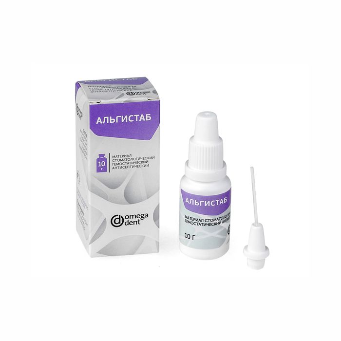 "АЛЬГИСТАБ" – это местный гемостатик, обладающий бактерицидным эффектом. Применяется для купирования луночкового кровотечения при удалении зубов, обработке зубных лунок, выравнивании гребнеобразных альвеолярных отростков, при кюретаже пародонтальных карманов, гингивэктомии и снятии зубного камня.