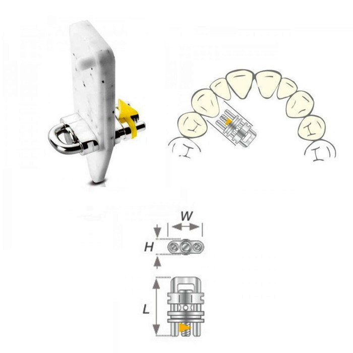 Секционный ортодонтический миниматюрный винт, для небольших конструкций, с желтой направляющей стрелкой.