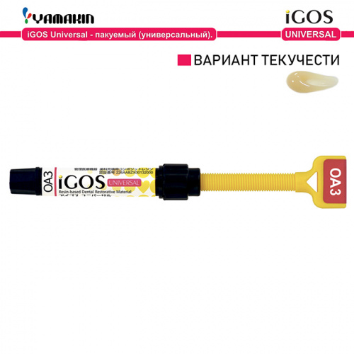Материал стоматологический пломбировочный «iGOS Flow», цирконосодержащий, светоотверждаемый, композитный на основе субмикронного керамического кластерного наполнителя, жидкотекучий: iGOS Flow в индивидуальной упаковке, 2,6г (1,5 мл), оттенок: А3.5 - 1шт./уп. в составе Одноразовая канюля Needle Tip 10 шт. Для прямых реставраций фронтальных и жевательных зубов, пломбировки полостей всех типов, ремонта сколов, керамических коронок и мостов. YAMAKIN CO., LTD (Япония)