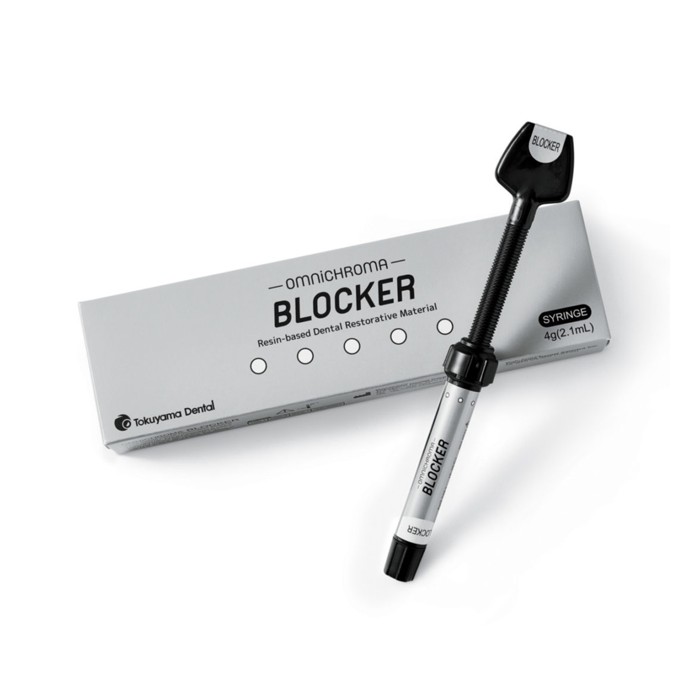 Omnichroma BLOCKER - дополнительный композитный материал, устраняющий оптическое влияние темноты полости рта и излишнюю прозрачность реставраций при восстановлении обширных сквозных дефектах передних зубов.