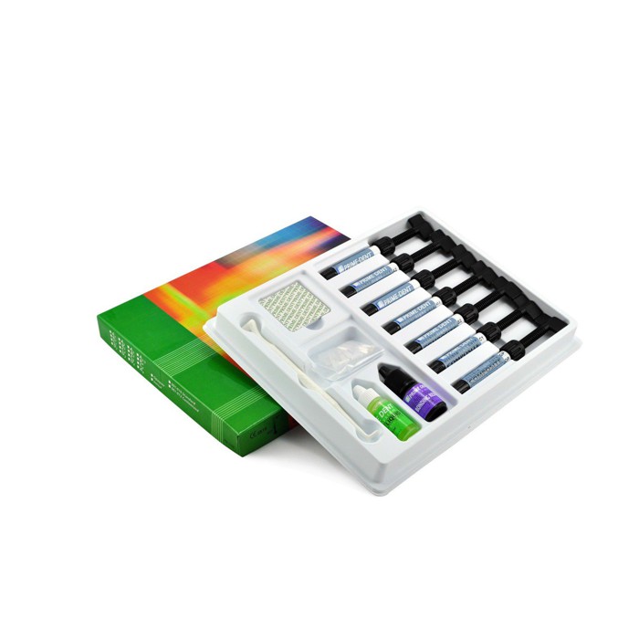 Упаковка: набор 7 шприцов по 4,5 г (цвета А1, А2, А3, А3.5, В2, С1, ОР) + бонд 7 мл., гель для травления 4 г, аксессуары. Срок годности 3 года.