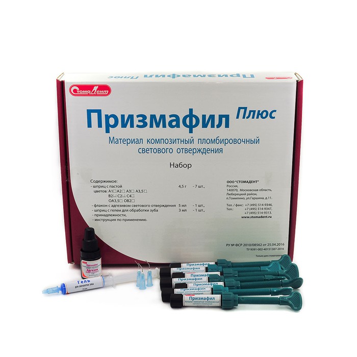 Призмафил композит св/отв. (7 шпр. х 4,5 г (цвета А2; А3; А3,5; В2; С2; С4; ОА3,5), гель 3 мл шприц, адгезив 5 мл, принадлежности.