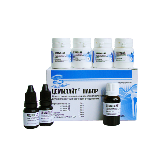 Стеклоиономерный цемент светового отверждения «Цемилайт» выпускается в виде комплекта порошок-жидкость, обладает высоким химическим сродством как к полимерным материалам, так и к тканям зуба, обеспечивает надежное краевое прилегание.