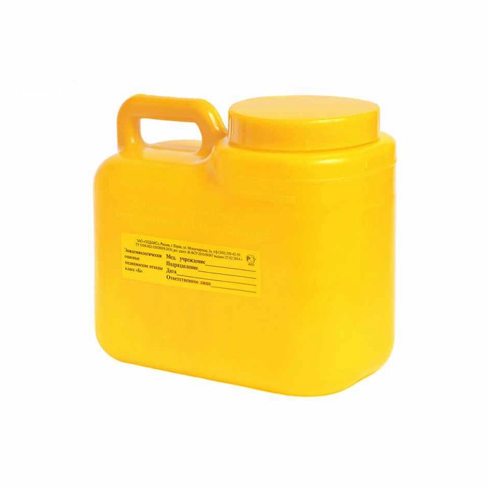 Контейнер для сбора медицинских отходов (класса Б) одноразовый, с резьбовой крышкой применяется в процедурных, операционных, лабораториях, на машинах скорой помощи, фельдшерских пунктах и пр. для сбора отходов, не подлежащих сбору в мягкую тару (пакеты). Выпускается емкостью 3 л.