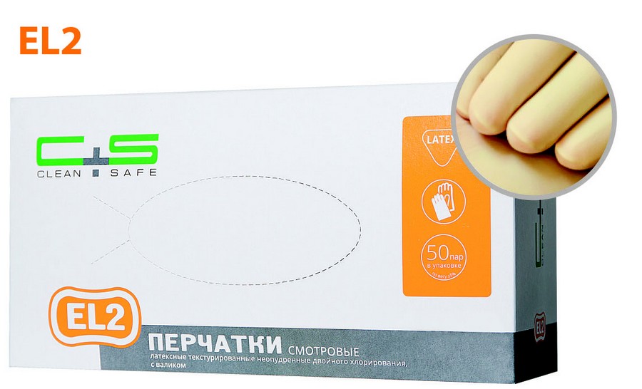 Перчатки Clean+Safe EL2 смотровые латексные полностью текстурированные неопудренные двойного хлоринирования с валиком на манжете, для проведения различных диагностических процедур, рекомендуются в стоматологической практике.