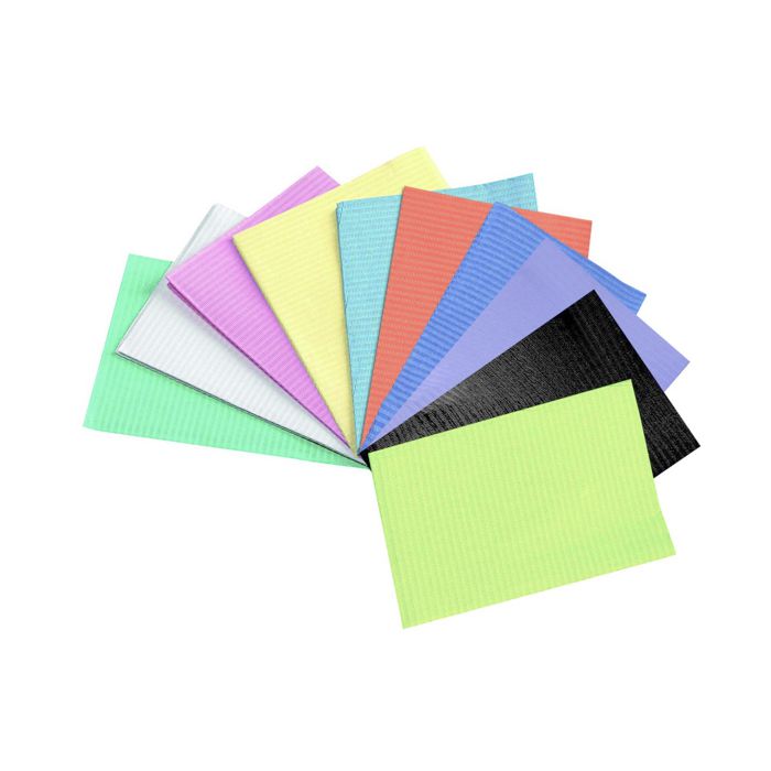 Салфетки нагрудные или салфетки процедурные сделаны из одного слоя сверхабсорбирующей 100% целлюлозной бумага-основы интенсивного цвета и одного слоя тонкой, прочной полиэтиленовой пленки.