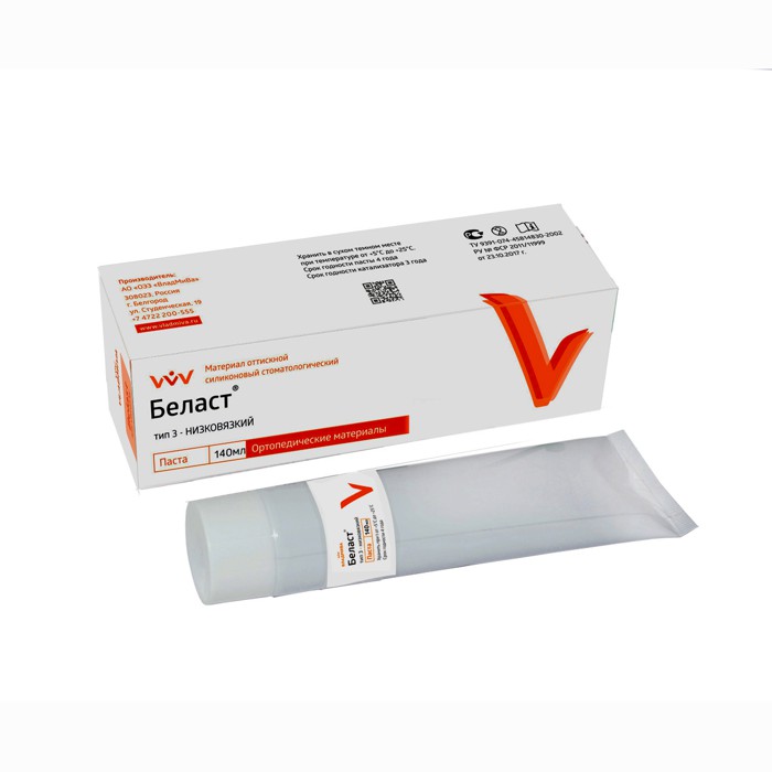 «Беласт» НИЗКОВЯЗКИЙ (ИСО 4823, тип 3) силиконовый оттискной материал, представляющий собой наполненную силиконовую композицию холодного отверждения конденсационного типа.