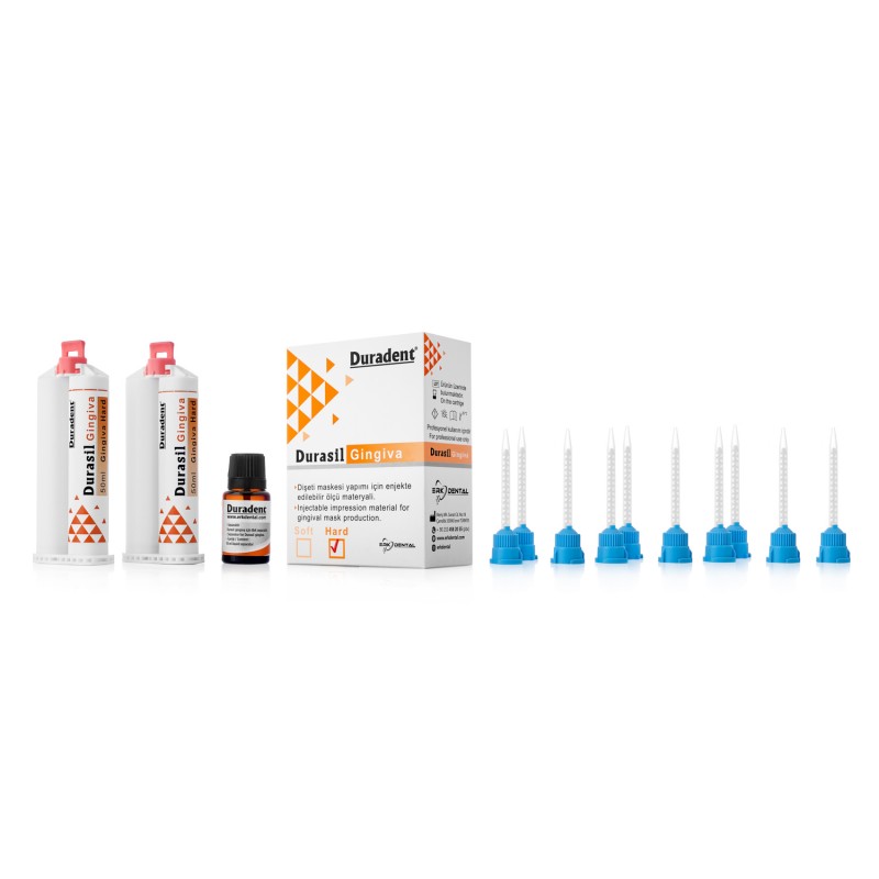 Durasil Gingiva hard - А-Силикон для воспроизведения десны на модели в зуботехнической лаборатории. Твёрдый. Упаковка: 2 картриджа по 50 мл, 1 флакон Separator 10 мл, 6 синих смесительных наконечников