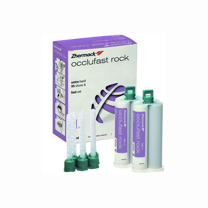 Окклюфаст ( Occlufast ROCK) представляет собой силикон фиолетового цвета категории А-Силиконов и предназначен для регистрации прикуса. Выпускается в упаковке из 2 штук по 50мл в каждом картридже.