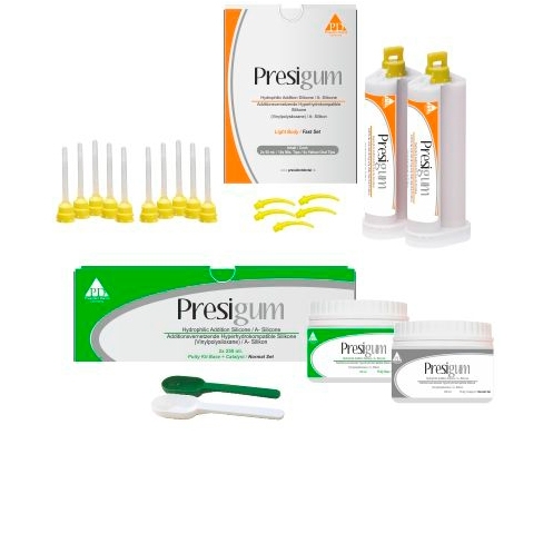 ОПИСАНИЕ: PRESIGUM NORMAL SET НАБОР-МАТЕРИАЛ ОТТИСКНОЙ ГИДРОФИЛЬНЫЙ А-СИЛИКОНОВЫЙ (ВИНИЛПОЛИСИЛОКСАН): PRESIGUM PUTTY KIT BASE NORMAL SET (250МЛ+ 250МЛ), PRESIGUM LIGHT BODY NORMAL SET 2Х50МЛ, НАСАДКИ ДЛЯ СМЕШИВАНИЯ, PRESIDENT DENTAL (ГЕРМАНИЯ)